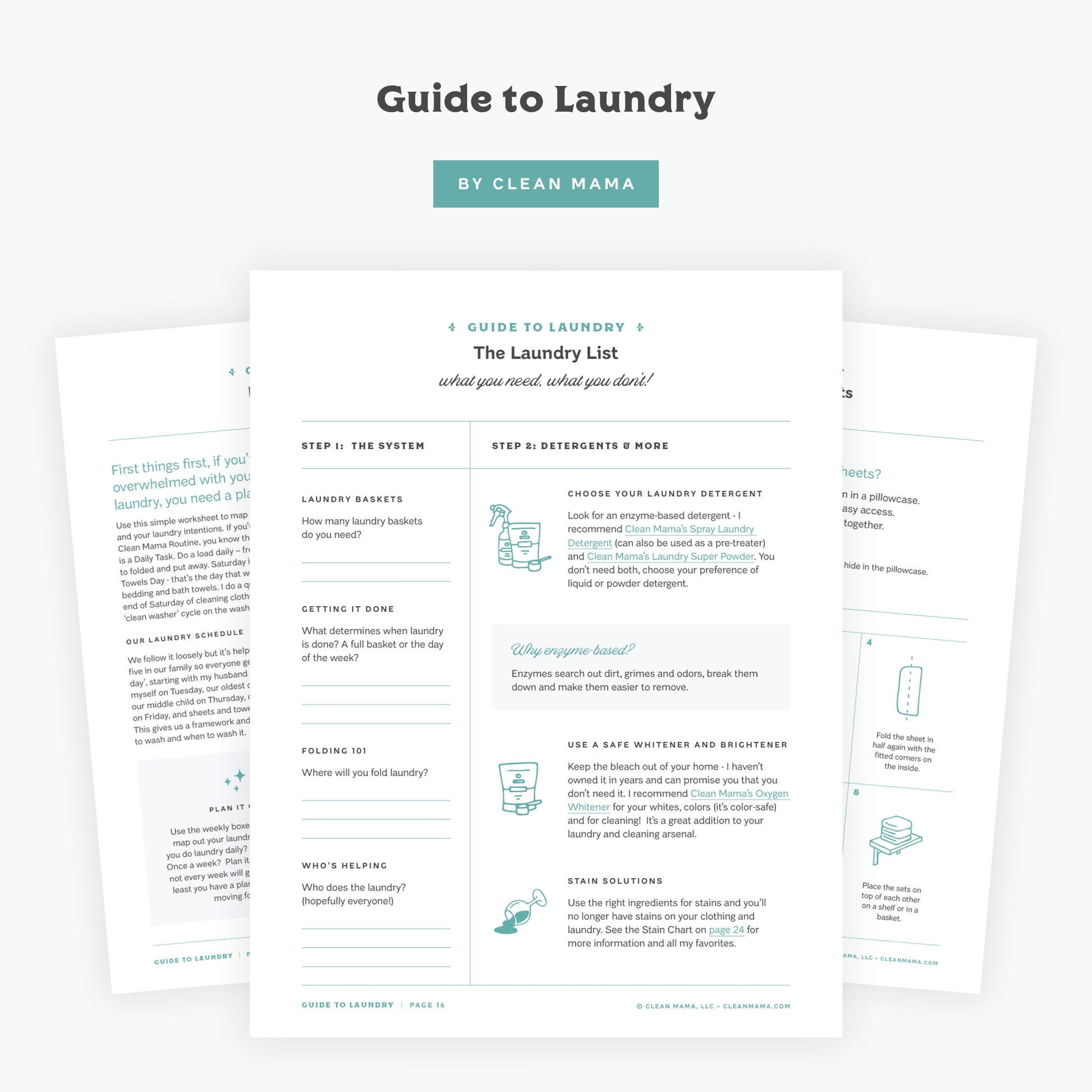 Clean Mama's Guide to Laundry is a 25-page fillable + printable PDF document that includes the following pages: